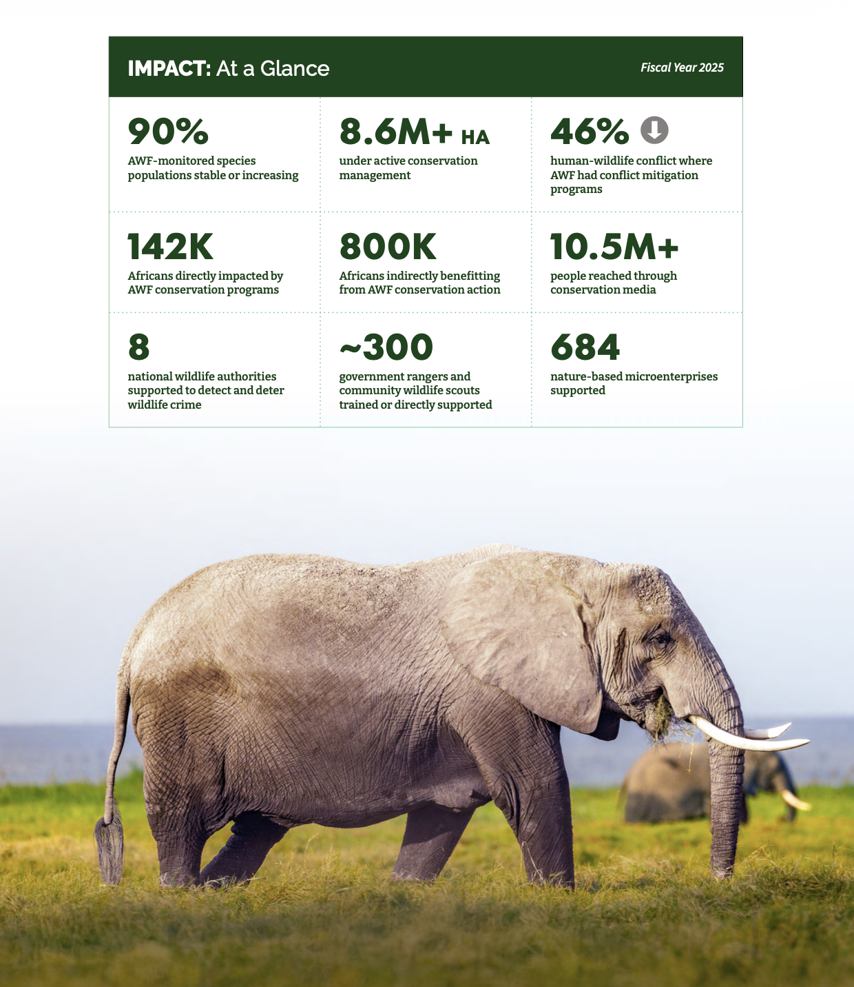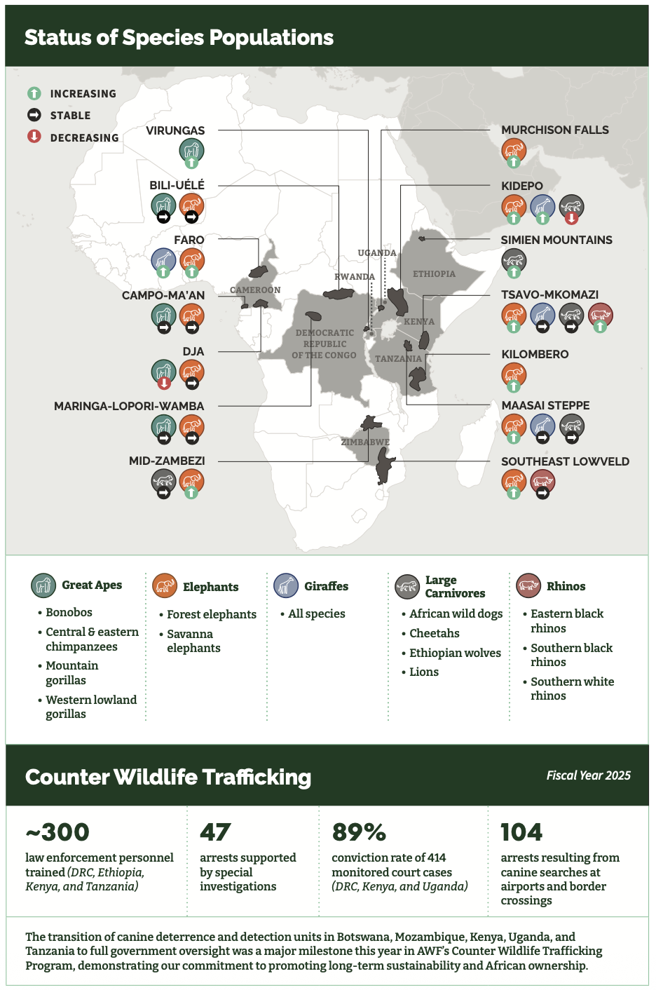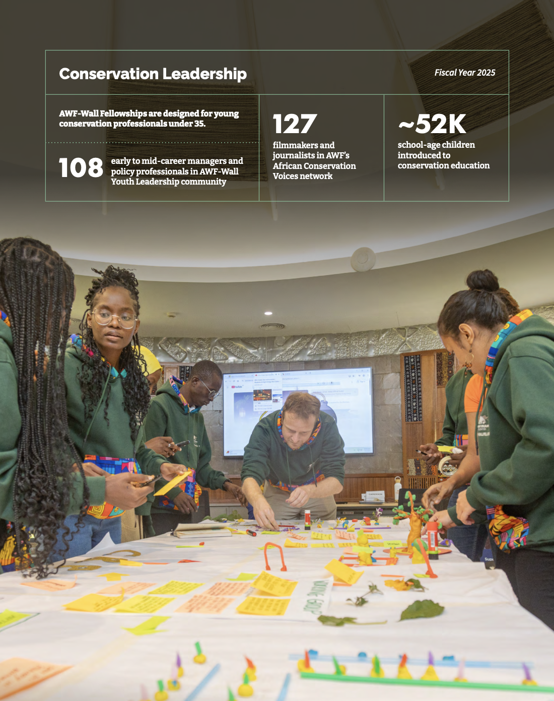 We emphasize African leadership—and responsibility—in making choices that protect our natural heritage. And we recognize the importance of partnership with a global community that shares our goal of building a future where people and wildlife thrive.