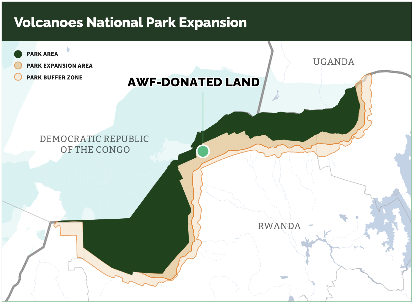 In partnership with the Government of Rwanda, the African Wildlife Foundation is continuing with an innovative model that positions ecosystem restoration as the driving force behind poverty alleviation and green growth. This is not conservation despite development, or development at the expense of nature. This is a rights-based approach that recognizes local communities as essential partners and the primary stewards of their natural heritage.