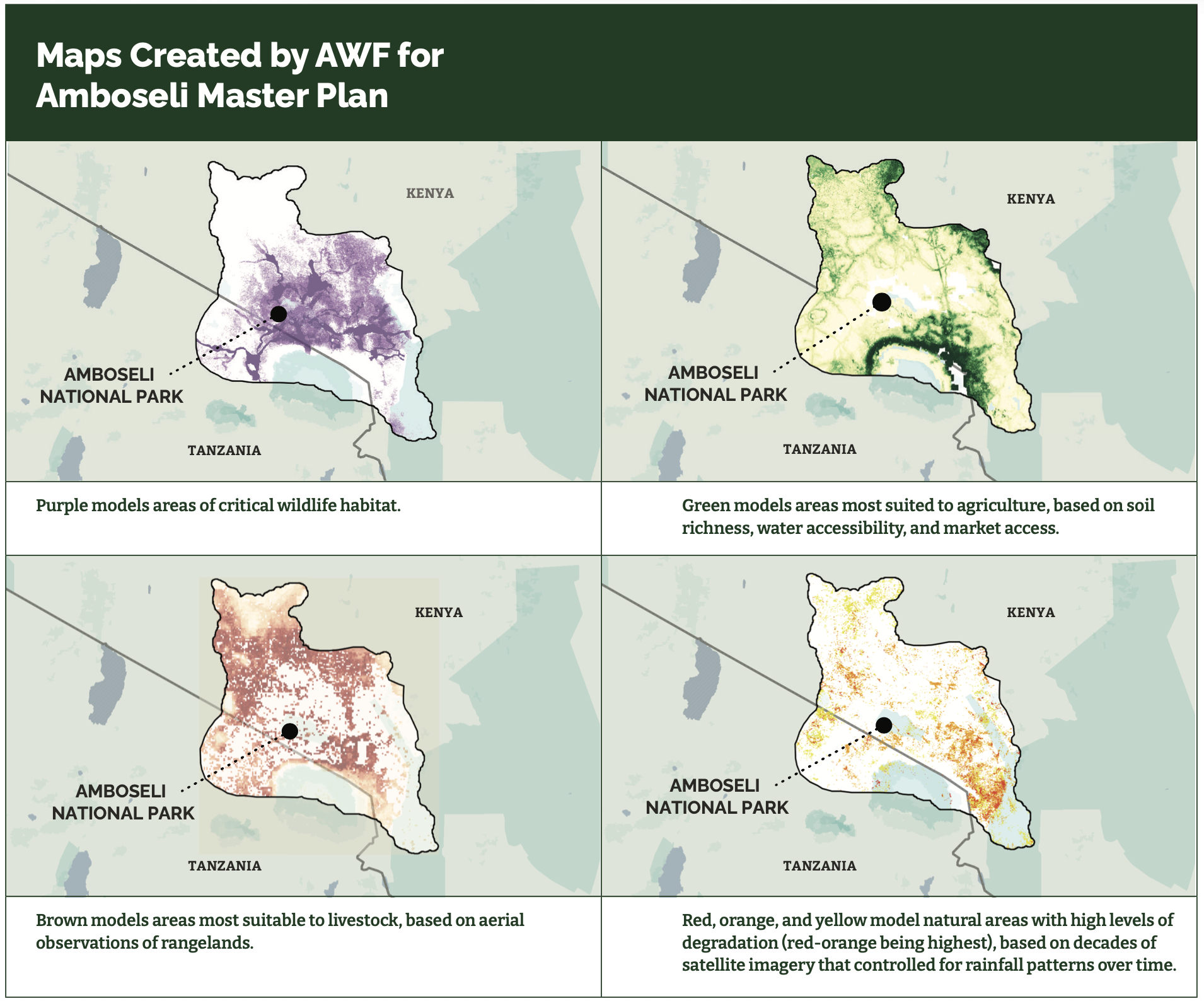 GIS analyses are informing a partnership with Kenya’s Kajiado County, which invited AWF to assist in creating a master plan for how the county can drive sustainable economic growth grounded in the Maasai community’s relationship with Amboseli National Park. As part of that plan, the team contributed stakeholder-informed spatial analyses of land use change, projected impacts, and models of tourism distribution. Additionally, we supported partner organizations in the landscape in onboarding and using GIS software. Work with wildlife authorities and other partners in the Faro (Cameroon) and Simien Mountains (Ethiopia) landscapes is leading to a more robust, consistent, and repeatable approach to spatial monitoring. And scenario modeling in Rwanda is helping the government make a case for a more sustainable green growth plan emphasizing wetland and forest protection towards enhanced water quality, flow, and climate resilience.