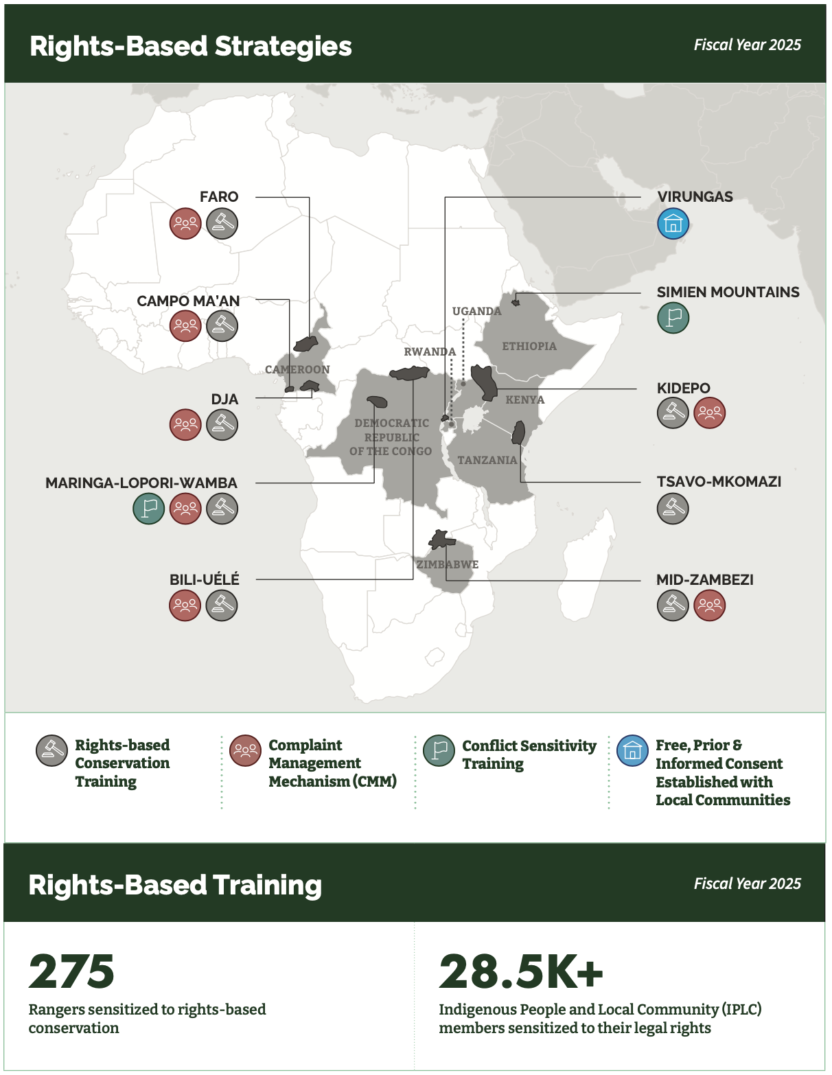 In Ethiopia, we have provided technical and financial support to develop the first ever Walia Ibex National Recovery and Action Plan, working closely with the Ethiopian Wildlife Conservation Authority (EWCA) and stakeholders. We also supported the Uganda Wildlife Authority’s (UWA) giraffe assessment in Kidepo and advanced Uganda’s rhino reintroduction program by training rangers from the Kidepo and Murchison landscapes in rhino monitoring and management. In Kenya, we are current members of national committees for rhinos and elephants and consult on economic development strategies impacting wildlife corridors and ecosystem services, including formulation of the 2025 Wildlife Conservation and Management Act.